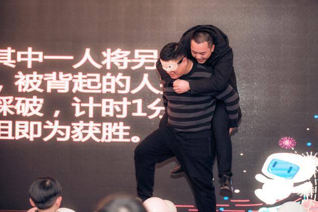 正所謂“男女搭配,干活不累”,伴隨著全場“嘭嘭嘭”,這位優秀的企業家背著小巧的女生,蒙眼連踩28個氣球,成為全場“最佳默契搭檔”。